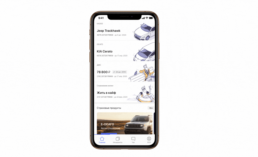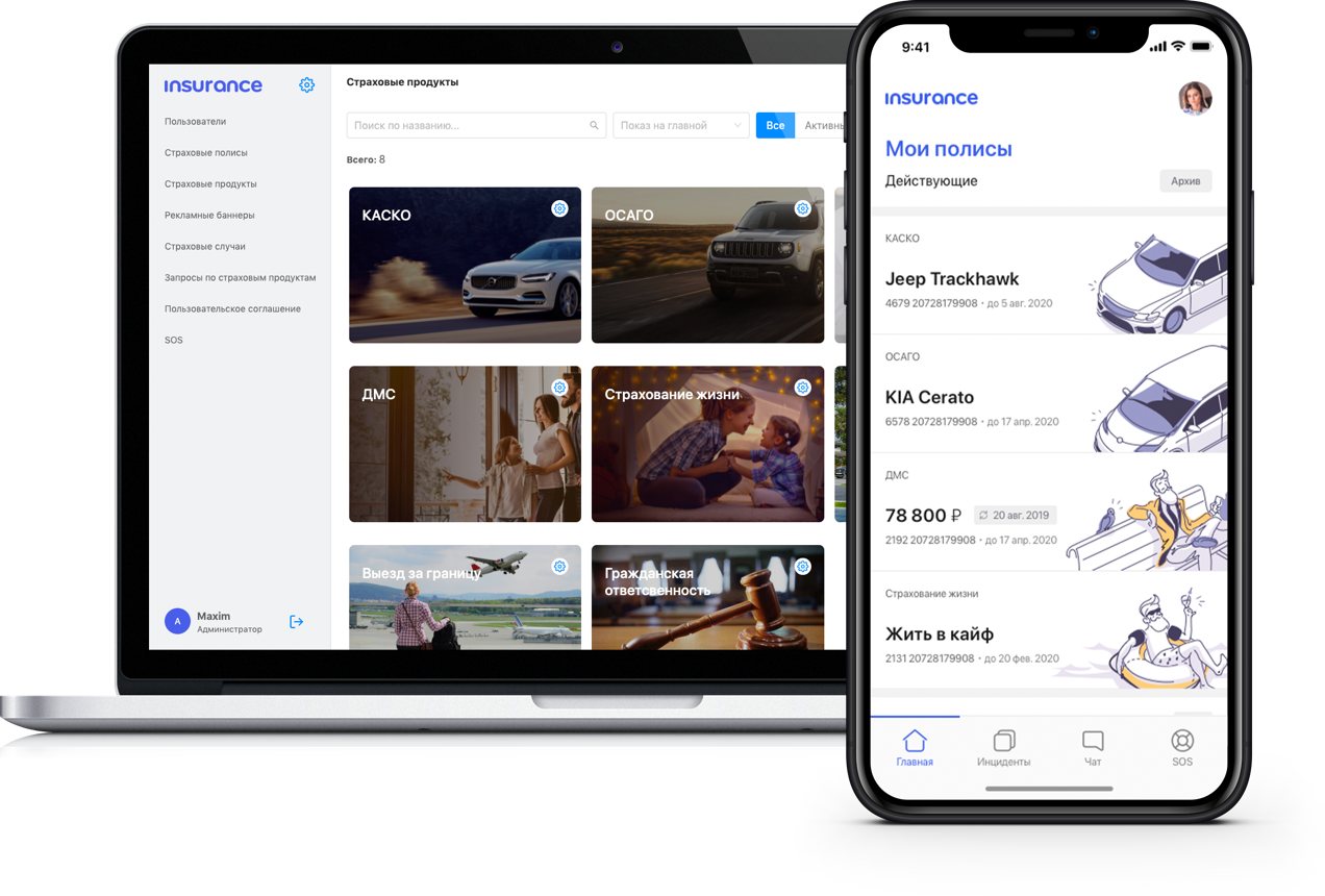 Страхователю доступны данные о полисах и возможность их продления, сохранение расчётов, связь со службой сопровождения клиентов и поддержка при страховом случае.